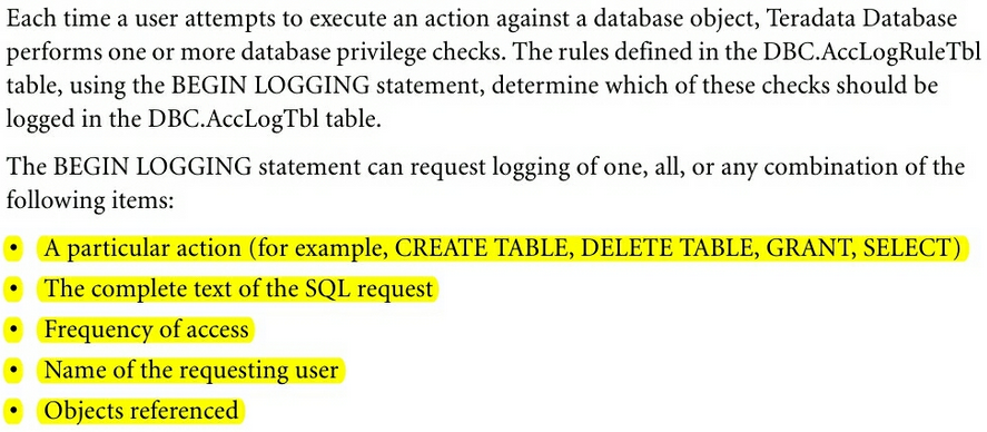 It turns out TeraData is fairly good in its logging capabilities. Based on the highlighted content, it appears one should be able to configure log generation specifically for a DBA performing a SELECT query on a table containing sensitive data.